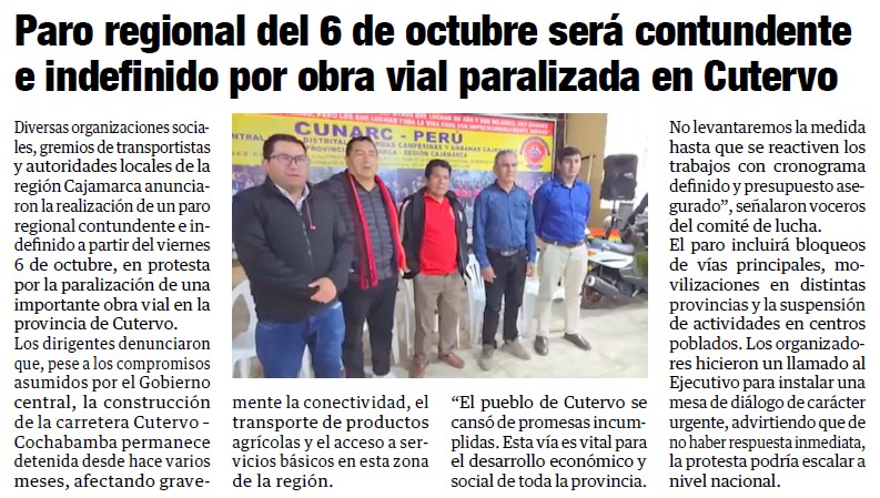 Paro regional del 6 de octubre será contundente e indefinido por obra vial paralizada en CutervoBy Monitoreo Medios / octubre 2, 2025