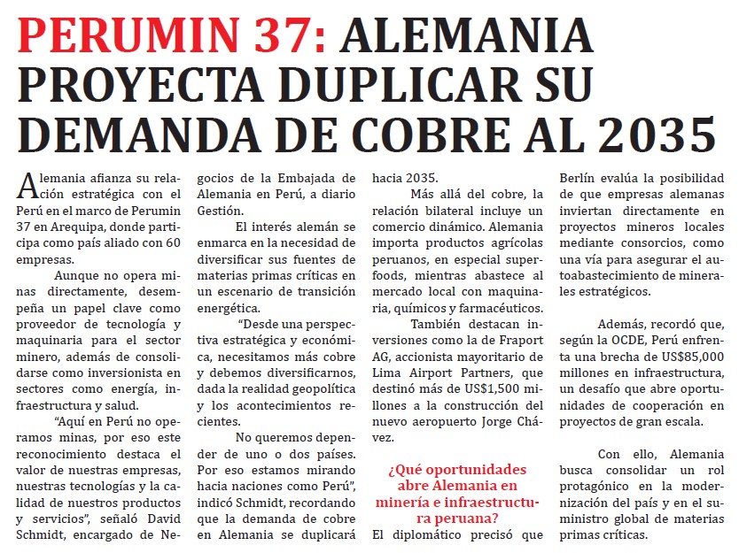 Perumin 37: Alemania proyecta duplicar su demanda de cobre al 2035By Monitoreo Medios / septiembre 1, 2025