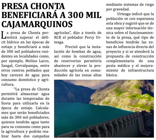 Presa Chonta beneficiará a 300 mil cajamarquinosBy Monitoreo Medios / julio 24, 2025 Fuente: Alma Noticias - Pág. 5Fecha: 24 julio, 2025