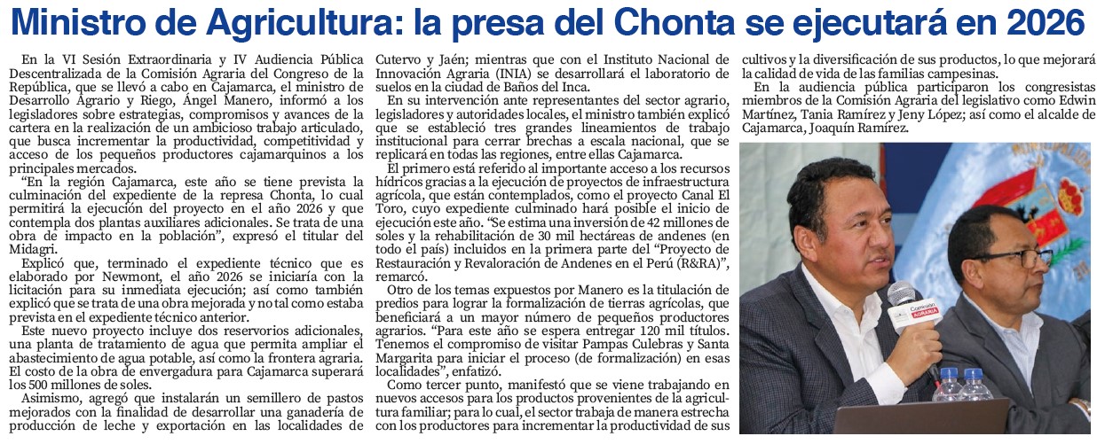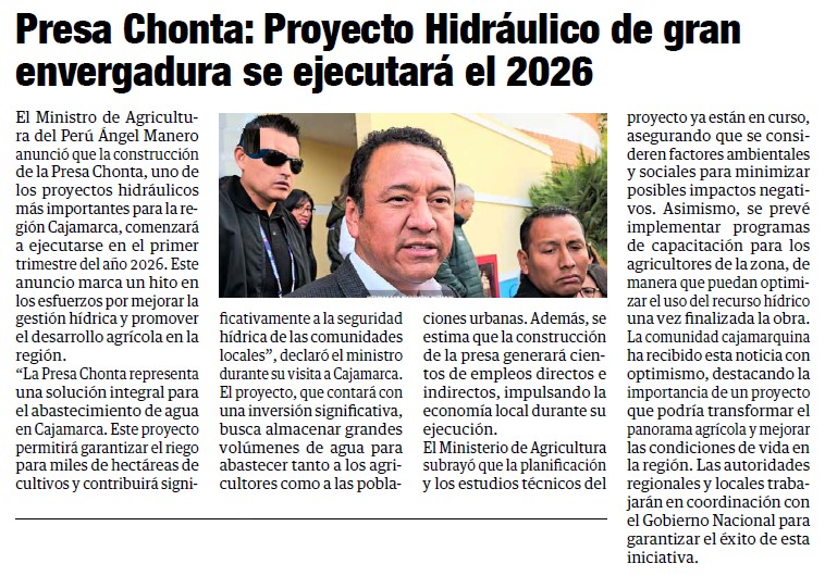 «Presa del Chonta se ejecutará en el 2026»By Monitoreo Medios / enero 17, 2025 FUENTE: El Mercurio – Pág. 6 / El Nuevo Diario – Pág. 4 / Panorama Cajamarquino – Pág. 9