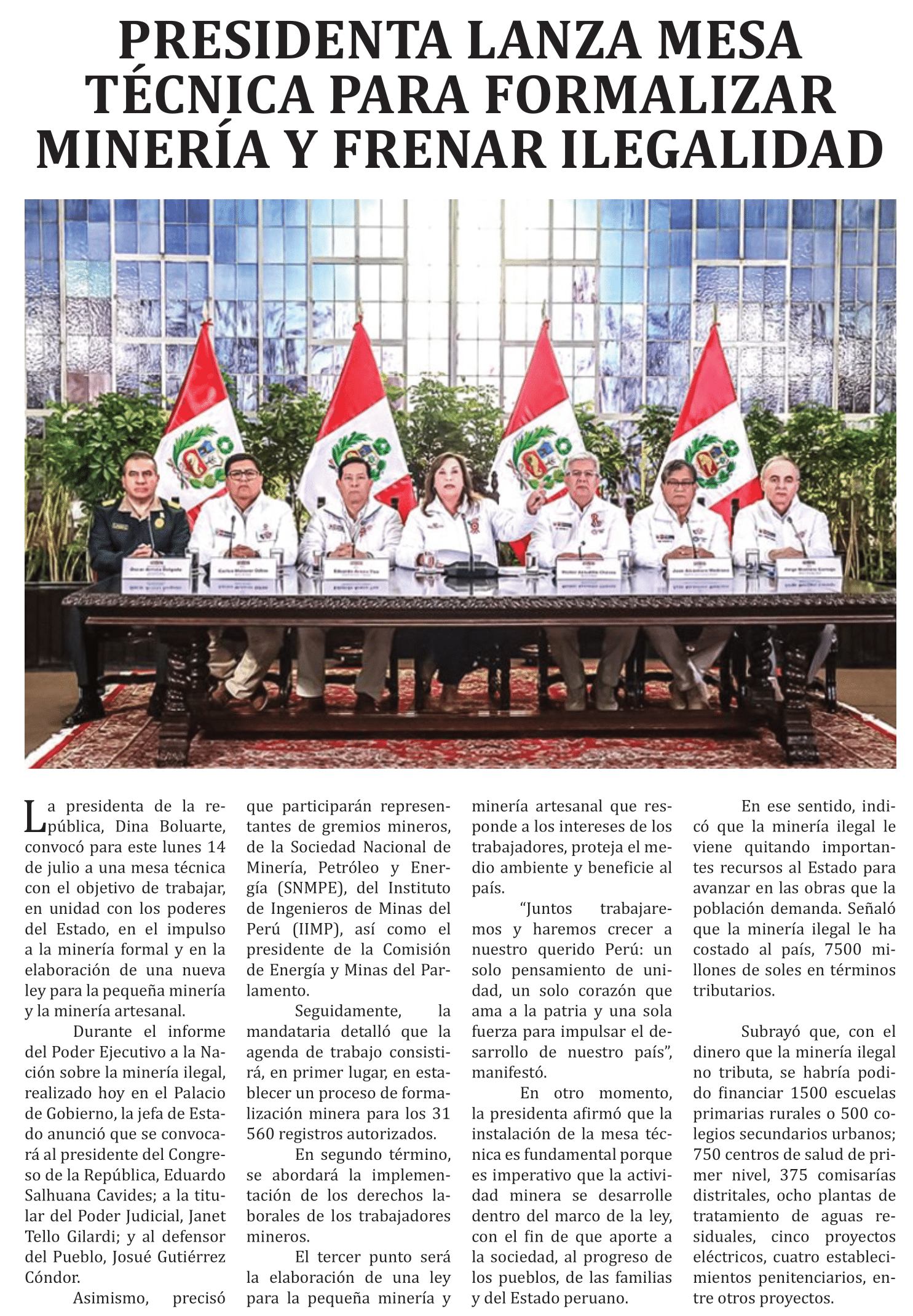 Presidenta lanza mesa técnica para formalizar minería y frenar ilegalidadBy Monitoreo Medios / julio 14, 2025 Fuente: Alma Noticias - Pág. 3Fecha: 14 julio, 2025