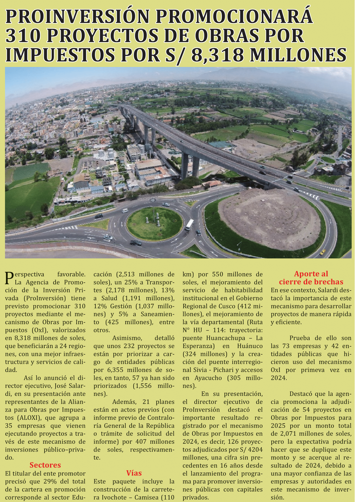 Proinversión promocionará 310 proyectos de obras por impuestos por S/8,318 millonesBy Monitoreo Medios / enero 28, 2025 FUENTE: Alma Noticias – Pág. 10