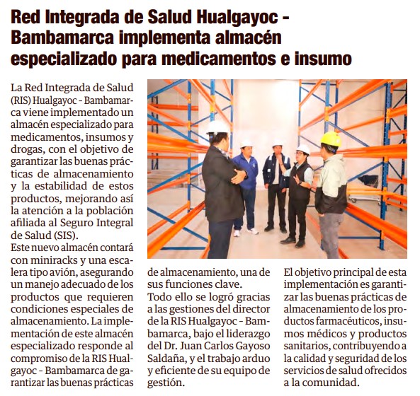 Red Integrada de Salud Hualgayoc – Bambamarca implementa almacén especializado para medicamentos e insumoBy Monitoreo Medios / junio 6, 2025 Fuente: Panorama Cajamarquino - Pág. 16Fecha: 6 junio, 2025