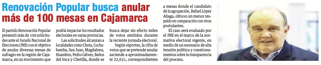 Renovación Popular busca anular más de 100 mesas en CajamarcaBy Monitoreo Medios / abril 20, 2026 Fuente: Panorama Cajamarquino - Pág. 23Fecha: 20 abril, 2026