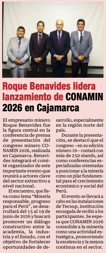 Roque Benavides lidera lanzamiento de CONAMIN 2026 en CajamarcaBy Monitoreo Medios / abril 20, 2026 Fuente: Panorama Cajamarquino - Pág. 23Fecha: 20 abril, 2026