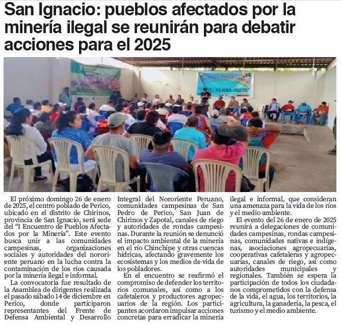 San Ignacio: pueblos afectados por la minería ilegal se reunirán para debatir acciones para el 2025By Monitoreo Medios / diciembre 23, 2024 FUENTE: El Nuevo Diario – Pág. 5