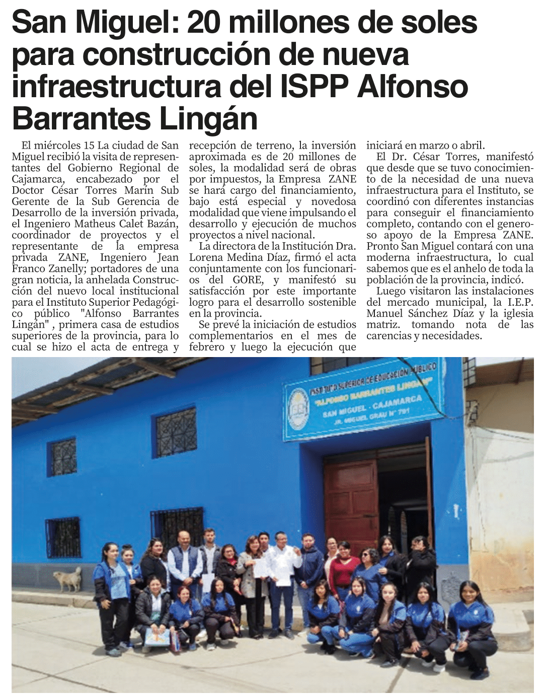 San Miguel: 20 millones de soles para construcción de nueva infraestructura del ISPP Alfonso Barrantes LingánBy Monitoreo Medios / enero 16, 2025 FUENTE: El Nuevo Diario – Pág. 6