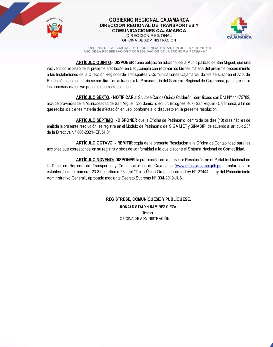 En respuesta a la solicitud presentada, respaldada por listado de vías en necesidad de atención, el gobierno regional de Cajamarca mediante la Resolución Administrativa D18-2025-GRCAJ/DRTC/ADM entrega en afectación de uso 03 volquetes por el periodo de un año. Las unidades entregadas están en óptimas condiciones operativas y de mantenimiento, con un promedio de 60,000 horas de trabajo lo que garantiza su eficiente uso en la rehabilitación y mantenimiento de las vías de comunicación en San Miguel.