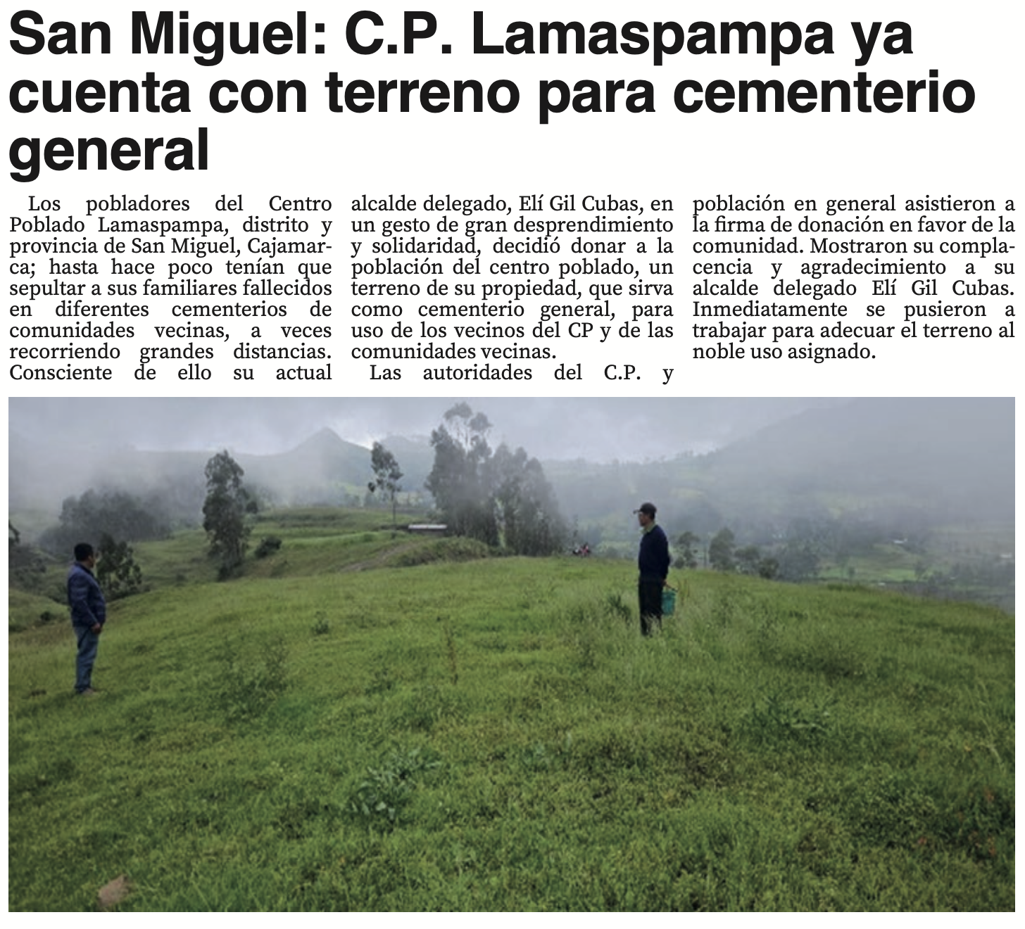 San Miguel: C.P. Lamaspampa ya cuenta con terreno para cementerio generalBy Monitoreo Medios / junio 19, 2025 Fuente: El Nuevo Diario - Pág. 4Fecha: 19 junio, 2025