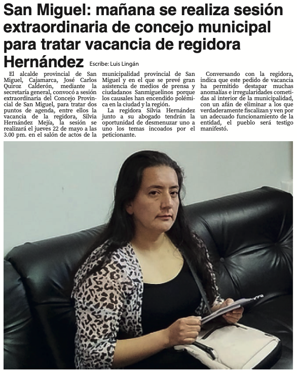 San Miguel: mañana se realiza sesión extraordinaria de concejo municipal para tratar vacancia de regidora HernándezBy Monitoreo Medios / mayo 21, 2025 FUENTE: El Nuevo Diario – Pág.6
