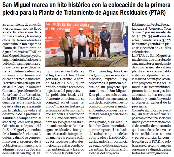 San Miguel marca un hito histórico con la colocación de la primera piedra para la PTARBy Monitoreo Medios / enero 6, 2025 FUENTE: Panorama Cajamarquino – Pág. 4