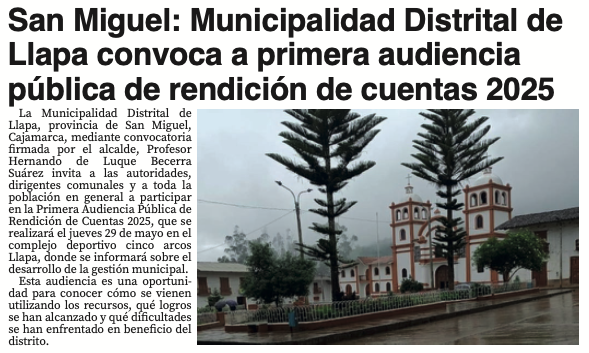 San Miguel: Municipalidad Distrital de Llapa convoca a primera audiencia pública de rendición de cuentas 2025By Monitoreo Medios / mayo 26, 2025 FUENTE: El Nuevo Diario – Pág. 5