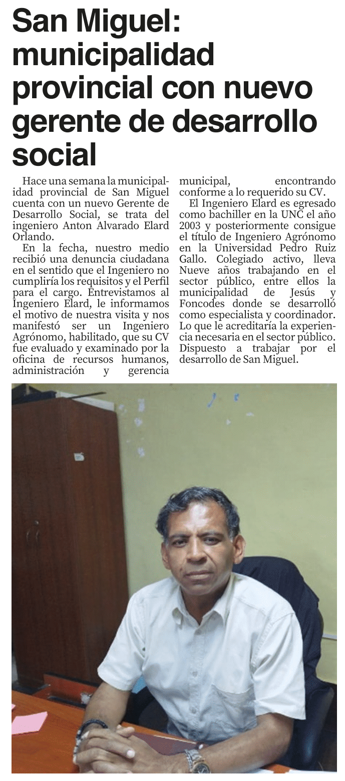 San Miguel: municipalidad provincial con nuevo gerente de desarrollo socialBy Monitoreo Medios / mayo 22, 2025 FUENTE: El Nuevo Diario – Pág. 5