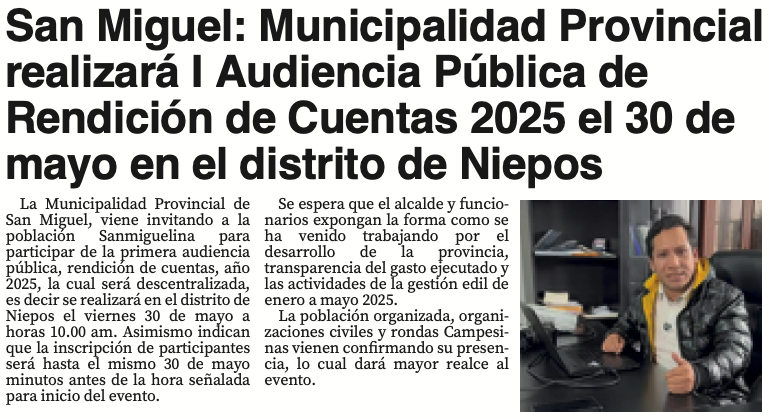 San Miguel: Municipalidad Provincial realizará I Audiencia Pública de Rendición de Cuentas 2025 el 30 de mayo en el distrito de NieposBy Monitoreo Medios / mayo 29, 2025 Fuente: El Nuevo Diario - Pág. 5Fecha: 29 mayo, 2025