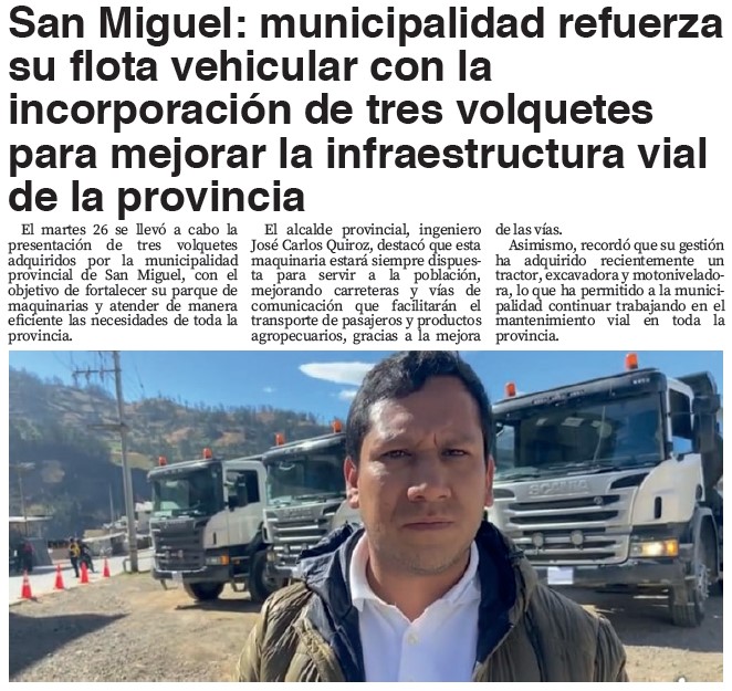 San Miguel: municipalidad refuerza su flota vehicular con la incorporación de tres volquetes para mejorar la infraestructura vial de la provinciaBy Monitoreo Medios / agosto 27, 2025