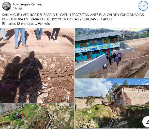 El martes 12 en horas de la mañana el alcalde provincial de San Miguel acompañado del gerente municipal y funcionarios de la municipalidad se presentaron ante Numerosos vecinos del barrio El Capulí, distrito y provincia de San Miguel Cajamarca, quienes manifestaron su indignación y fastidio por las mentiras ante la demora en los trabajos que se ejecutan en el proyecto pistas y veredas del barrio El Capulí, ejecutado por el consorcio CG y el financiamiento de la municipalidad provincial de San Miguel.