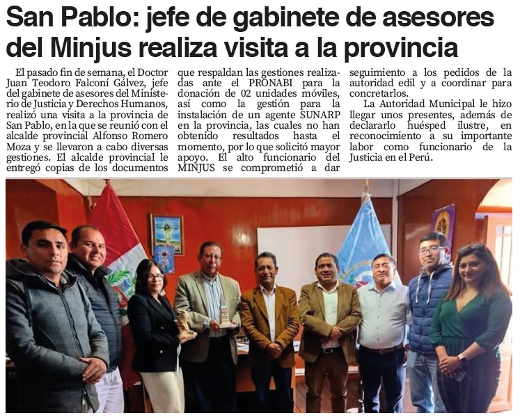 San Pablo: jefe de gabinete de asesores del Minjus realiza visita a la provinciaBy Monitoreo Medios / enero 28, 2025 FUENTE: El Nuevo Diario – Pág. 5