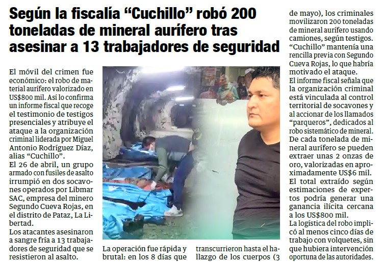 Según la fiscalía «Cuchillo» robó 200 toneladas de mineral aurífero tras asesinar a 13 trabajadores de seguridadBy Monitoreo Medios / mayo 20, 2025 FUENTE: Panorama Cajamarquino – Pág. 3