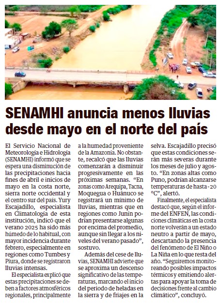 SENAMHI anuncia menos lluvias desde mayo en el norte del paísBy Monitoreo Medios / abril 25, 2025 FUENTE: Panorama Cajamarquino – Pág. 4