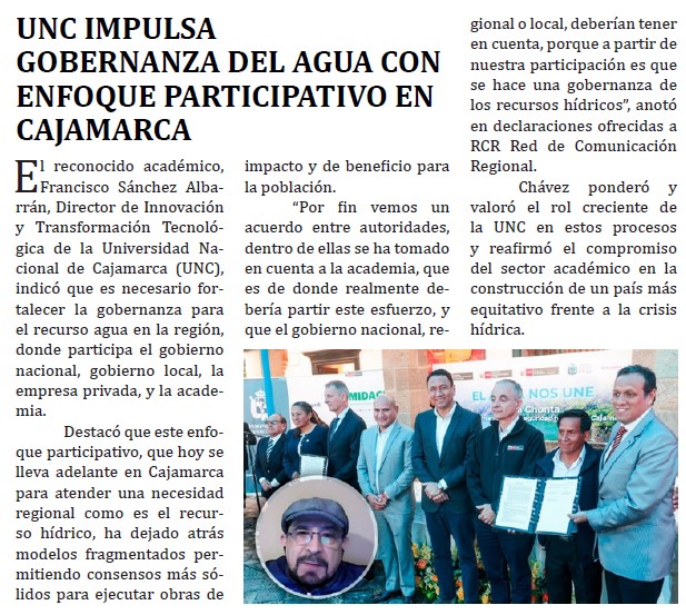 UNC impulsa gobernanza del agua con enfoque participativo en CajamarcaBy Monitoreo Medios / julio 10, 2025 Fuente: Alma Noticias - Pág. 5Fecha: 10 julio, 2025