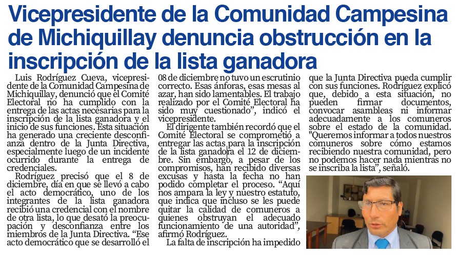 Vicepresidente de la comunidad campesina de Michiquillay denuncia obstrucción en la inscripción de la lista ganadoraBy Monitoreo Medios / diciembre 17, 2024 FUENTE: El Nuevo Diario – Pág. 3